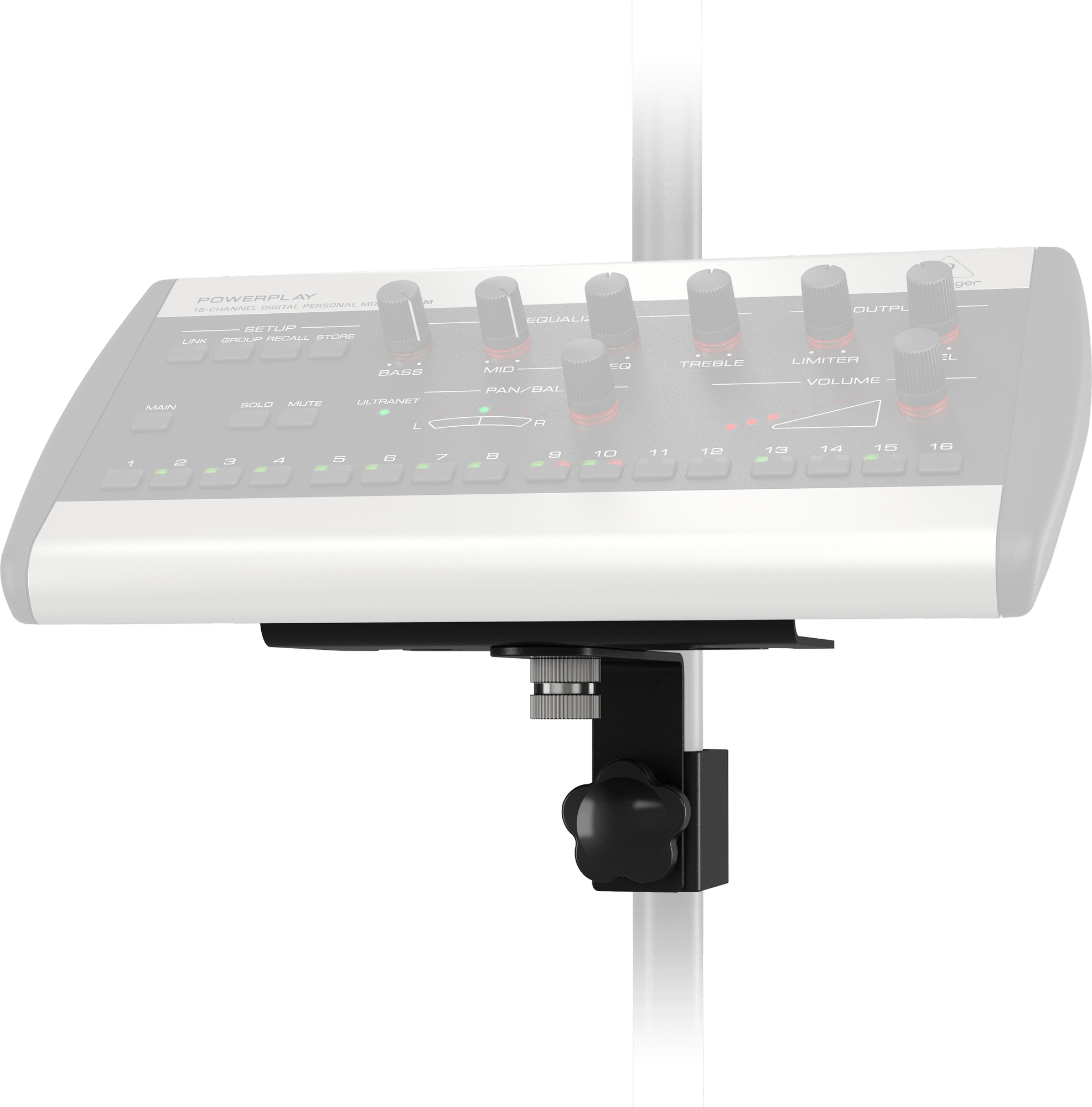 The ultra-convenient P16-MB mounting bracket is the perfect way to place the P16-M Digital Personal Mixer where the musicians need it – on any standard microphone, music or drum stand.