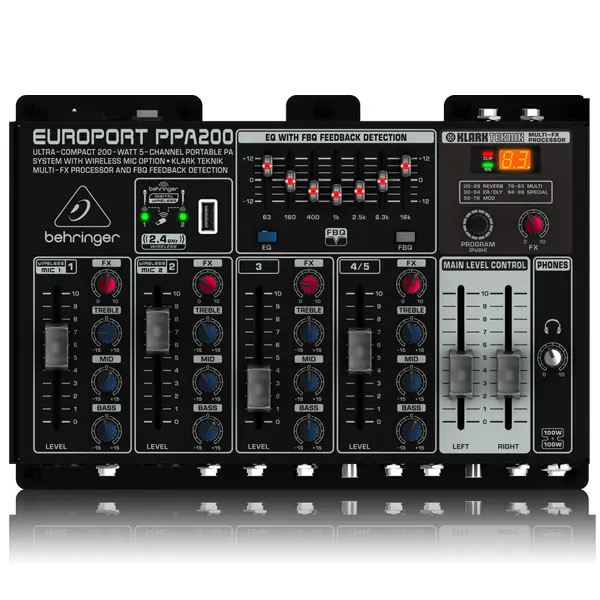 BEHRINGER PPA200 Ultra-Compact 200-Watt 5-Channel Powered Mixer with Wireless Microphone Option, KLARK TEKNIK Multi-FX Processor and FBQ Feedback Detection