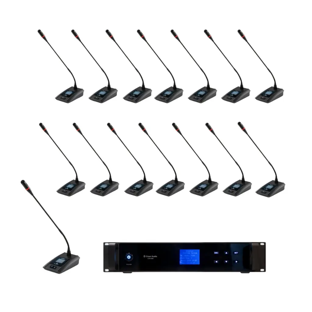 Clean Audio CON-888 SET 14 ชุดไมค์ประชุมดิจิตอล 15 ท่าน (ไมค์ประธาน 1 ท่าน ไมค์ผู้ร่วมประชุม 14 ท่าน) เป็นไมโครโฟนประชุมคุณภาพสูง ด้วยคุณสมบัติและเทคโนโลยีที่ทันสมัย ทำให้เหมาะสำหรับการใช้งานในห้องประชุมขนาด เล็ก กลาง ถึงใหญ่