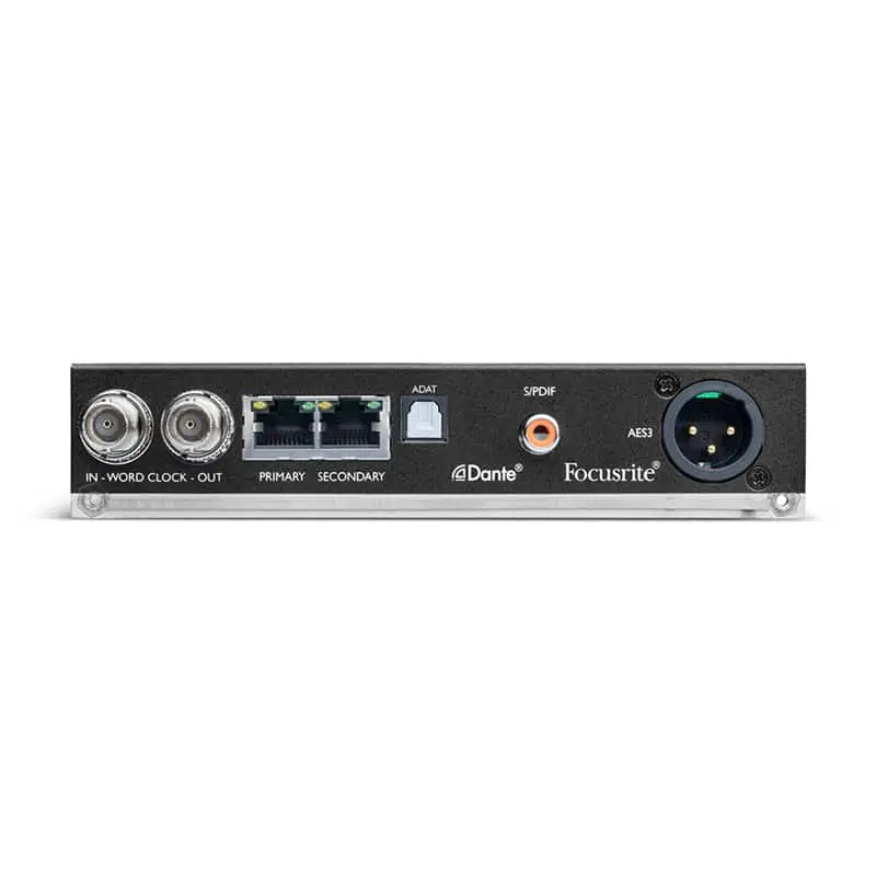The card offers primary and secondary RJ45 Dante output ports, an XLR connector for AES3 output, a TOSLINK connector for ADAT output and RCA connector for S/PDIFoutput. Word Clock I/O on BNC connectors allows synchronisation to multiple digital sources. This also includes syncing the Dante network to house clock,or for syncing external equipment to the Dante network.