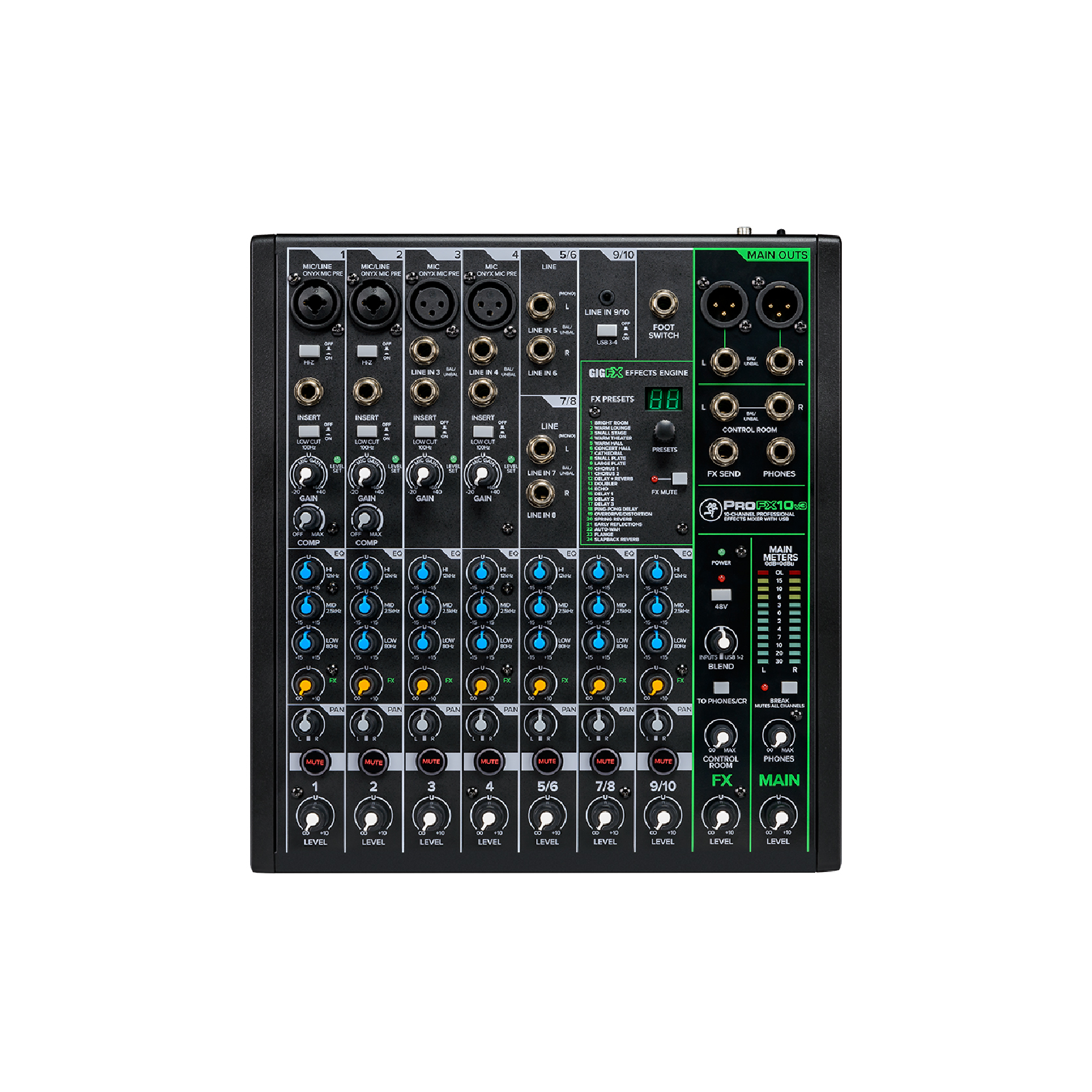ProFXv3 mixers take the best-selling series to the next level for live mixing, recording, and content creation. Now with Onyx mic preamps, 2×4 192kHz recording, GigFX effects engine, and a new modern design.