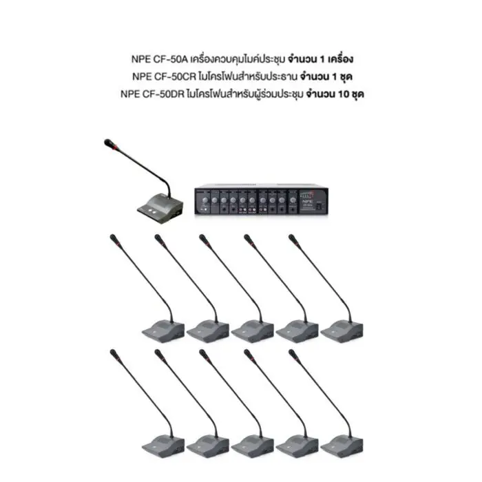 NPE CF-50 Series ชุดไมค์ประชุม 11 ท่าน ชุดไมค์ประชุมสำหรับ 11 ท่าน ก้านไมค์ยาว 48 ซม.ในซีรีย์ CF-50 ประกอบด้วย เครื่องควบคุมไมโครโฟนประชุม NPE CF-50A ที่เชื่อมต่อกับชุดไมค์ประชุมได้สูงสุด 50 ชุด ไมโครโฟนประชุม NPE CF-50CR สำหรับประธาน และ NPE CF-50DR สำหรับผู้ร่วมประชุม