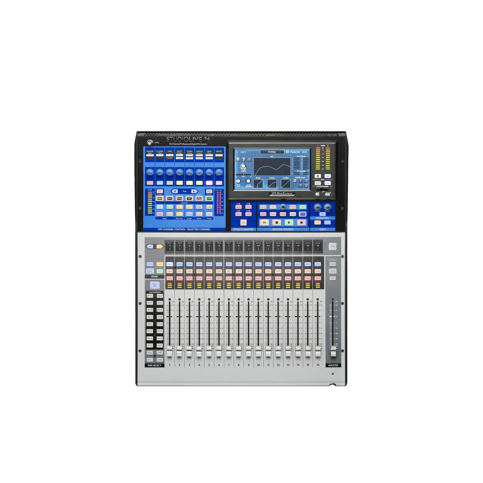 The dynamic Fat Channel on the StudioLive 16 digital mixer puts critical EQ and Dynamics functions beneath your fingertips while giving you fast access to every parameter via the full-color touchscreen or from the Fat Channel encoders, depending on how you like to work. The StudioLive 16 digital mixer comes with ten vintage EQ and classic compressor Fat Channel plug-in models that can be used onboard your mixer as well as within Studio One. And when you’re ready for more options, PreSonus offers four Fat Channel plug-in collections with fifteen additional models from which to choose, giving you a host of new signal processing options. While Fat Channel plug-ins are available for every input channel, every output bus on the StudioLive 16 digital mixer is equipped with a fully variable 6-band parametric EQ, compressor, and limiter. Now you can enjoy extensive, studio-style processing whether recording in the studio or running shows on the road.