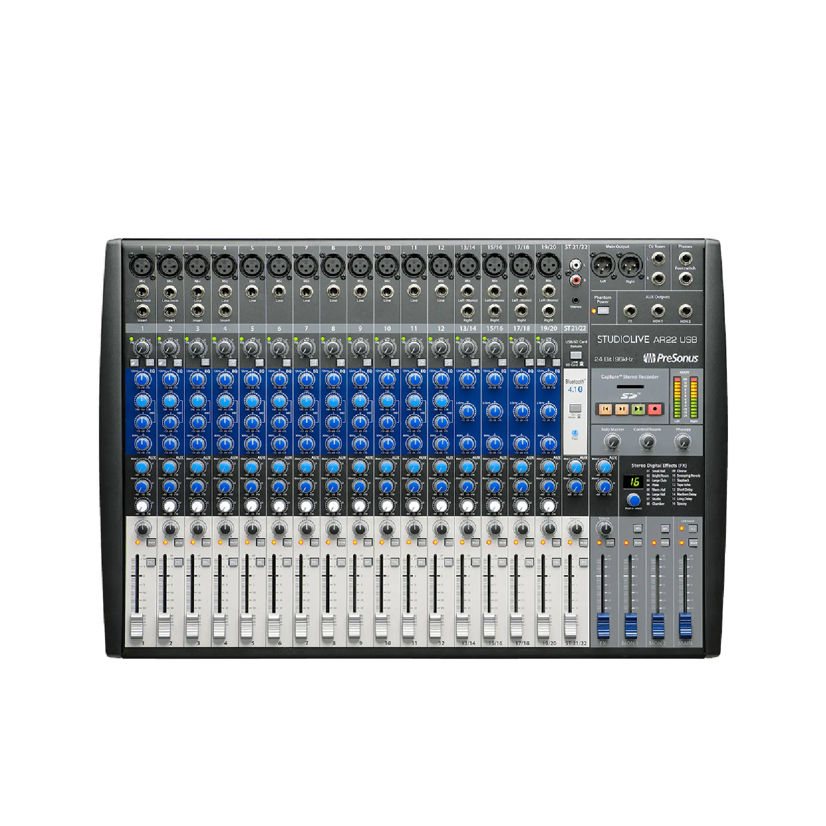 PRESONUS StudioLive AR22 USB 22-channel hybrid mixers make it simple to mix and record live shows, studio productions, band rehearsals, podcasts, and much more. This is a musician’s mixer: lightweight, versatile, feature-rich, and packed with analog connections and digital tools, yet easy to learn and use. Mix with 16 of PreSonus®’ famous Class A preamps and three-band EQ. Create multitrack recordings and fly in backing tracks with a 24-bit, 96 kHz, USB 2.0 digital audio interface. Record and playback in stereo with the integrated SD digital recorder. Stream program music wirelessly, using onboard Bluetooth® connectivity. Compact and road-ready, StudioLive AR mixers provide a superior all-in-one solution for mixing and recording your performances.
