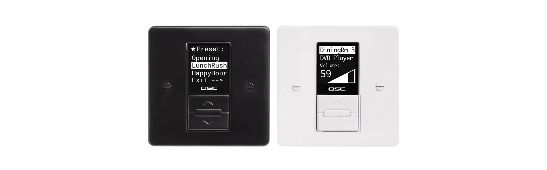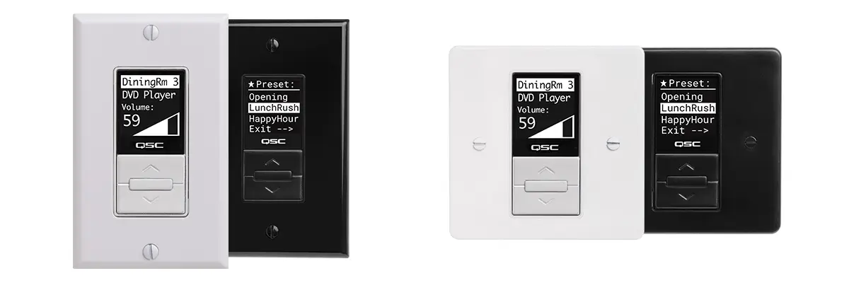 The black QSC MP-MFC is an elegant, Decora-style wall mount controller for use with MP-M Series music and paging mixers. Its intuitive system control allows designers to configure with as much or as little control over the system as needed.
