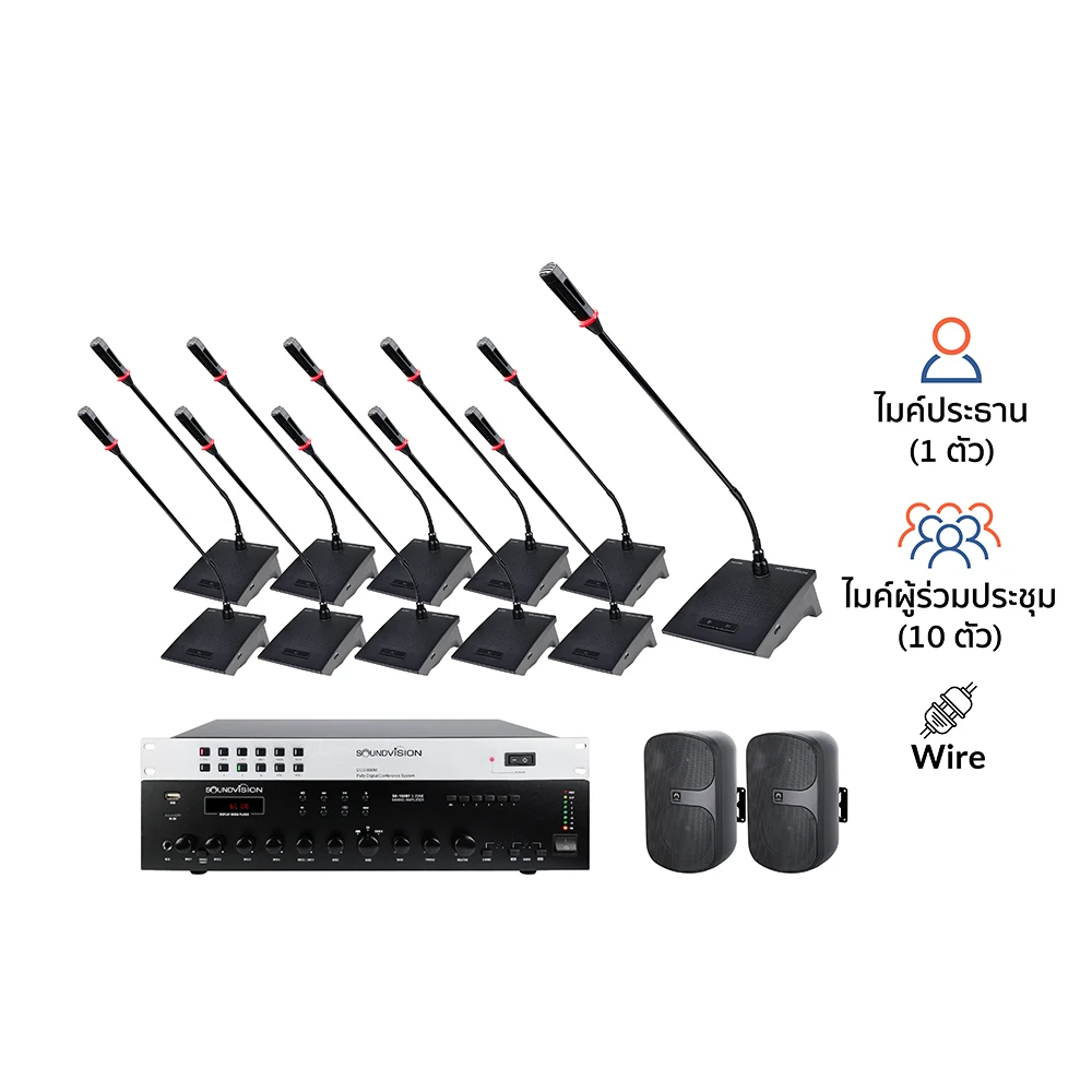ชุดไมค์ประชุมดิจิตอล 11 ท่าน แบบใช้สาย SOUNDVISION DCS-800 Conference Systems (ไมค์ประธาน 1 ท่าน ไมค์ผู้ร่วมประชุม 10 ท่าน) พร้อม SOUNDVISION SA-150BT มิกเซอร์แอมป์ขยายเสียง พร้อมฟังก์ชั่นบลูทูธ และ USB/SD Card Playe, SOUNDVISION SVS-62W ตู้ลำโพงติดผนัง ชุดเครื่องเสียงห้องประชุมนี้มีจุดเด่นคือ ติดตั้งง่าย อุปกรณ์น้อย แต่ให้คุณภาพเสียงดี และฟังก์ชั่นการทำงานที่ครบ ในราคาที่คุ้มค่า