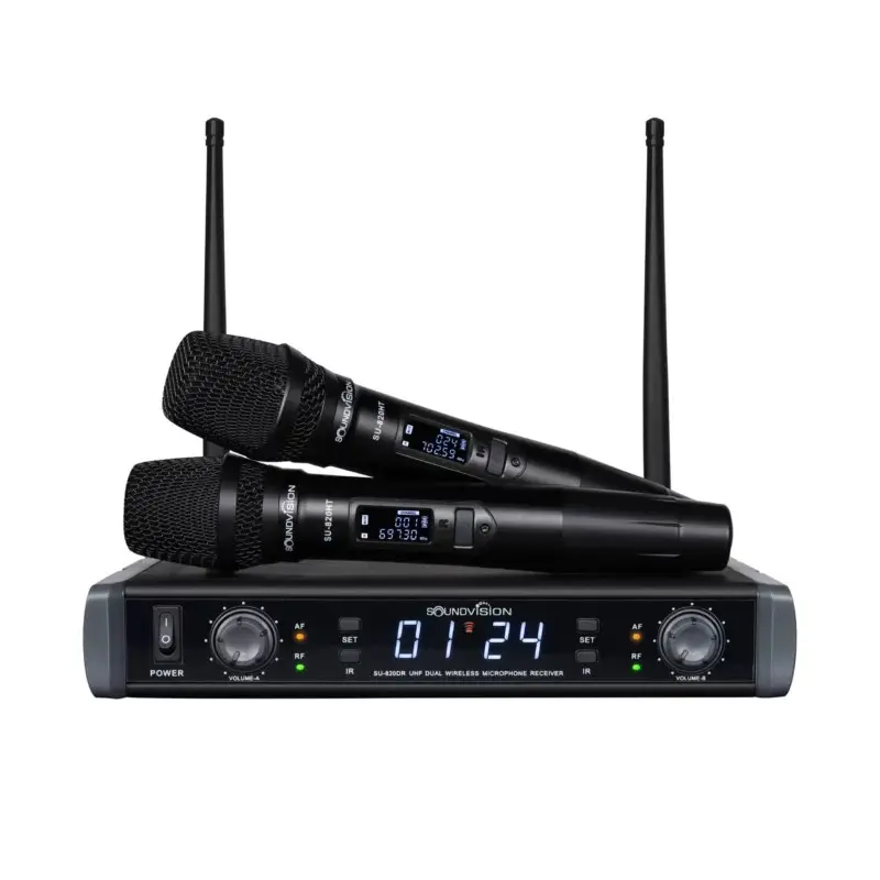 SOUNDVISION SU-820D/HT ไมค์ลอย มือถือคู่ ย่าน UHF คลื่นความถี่ 697.3 – 702.7 MHz การตอบสนองความถี่ 30Hz ~ 20kHz ± 2dB ช่องความถี่เลือกได้ถึง 48CH ไม่มีการรบกวนจากการแทรกสัญญาณ มาพร้อมกับจอ LCD เพื่อแสดงค่าความถี่ และระดับแบตเตอรี่ จากแบรนด์ SOUNDVISION