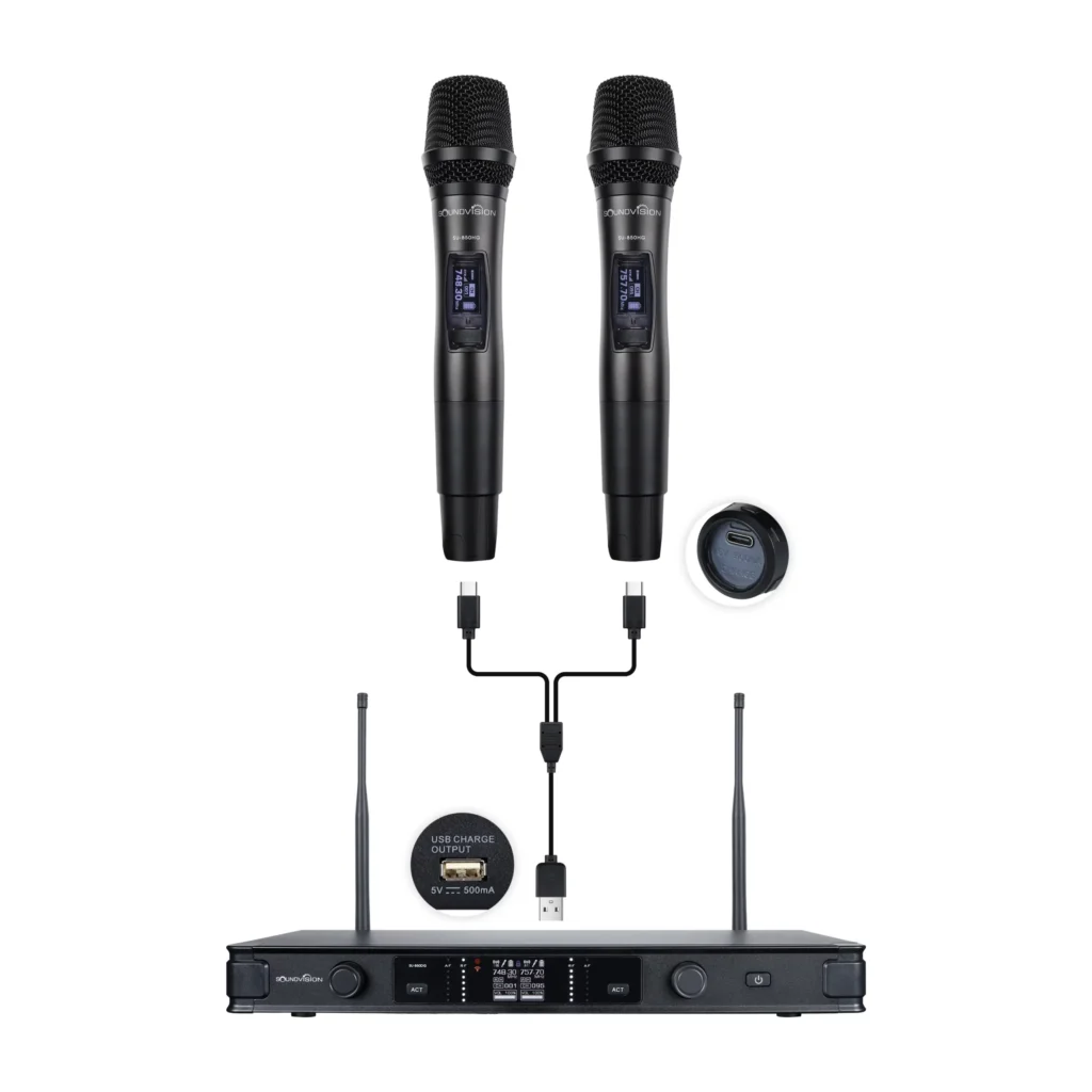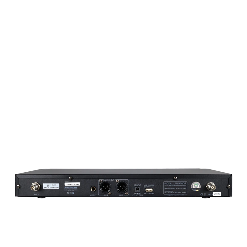 ไมโครโฟนไร้สายมือถือคู่ ช่วงย่านความถี่ UHF 748.3 ~ 757.7 MHz ตามข้อกำหนดของกสทช. (ประเทศไทย) สามารถเปลี่ยนช่อง ความถี่สัญญาณได้ 190 ช่อง (2 x 95) กำลังส่ง 5mW / 20mW รับสัญญาณได้ไกลถึง 100 เมตร (ที่โล่งแจ้ง) ด้วยตัวเครื่องรับสัญญาณ ที่เต็มประสิทธิภาพ ความสามารถในการป้องกันการ รบกวนที่ดีเยี่ยม และสามารถชาร์จไมโครโฟนกับเครื่องรับได้