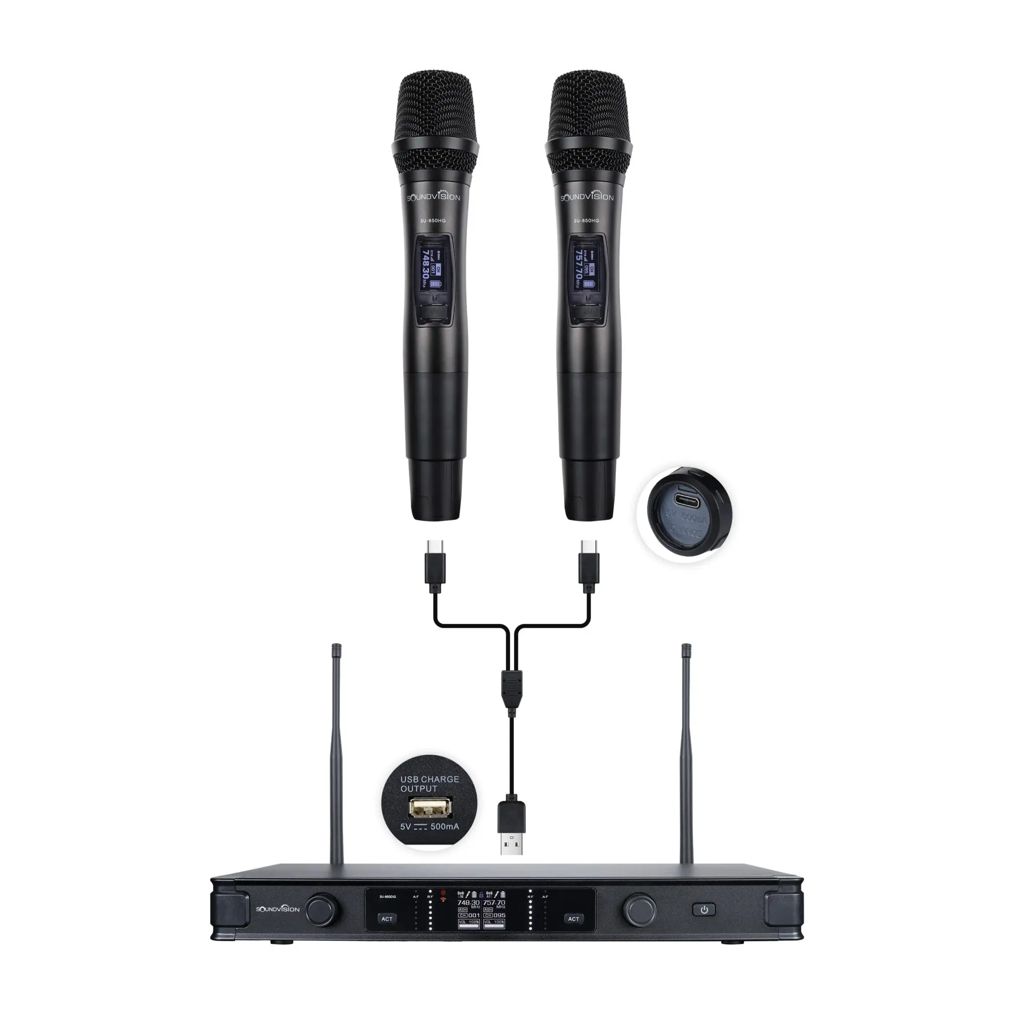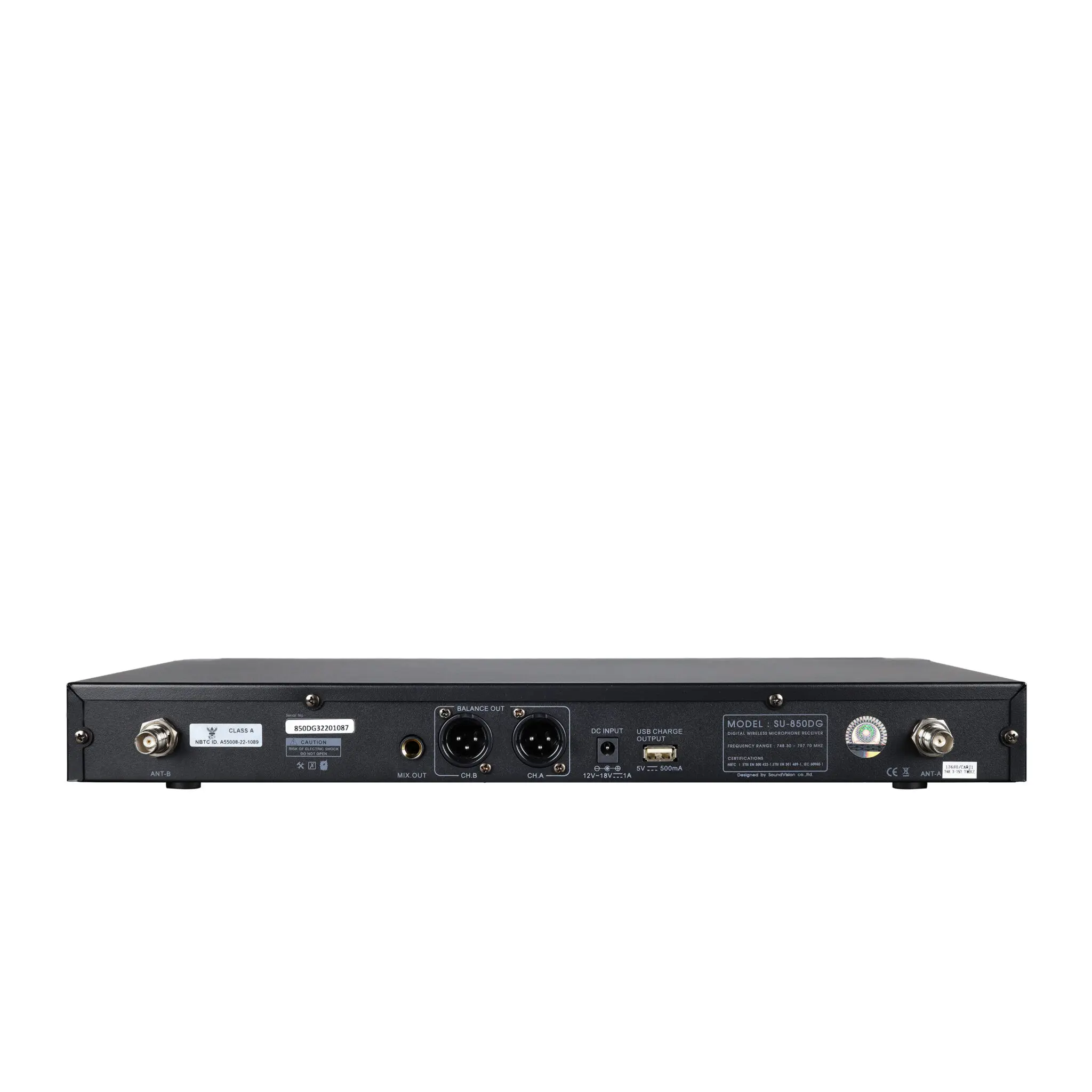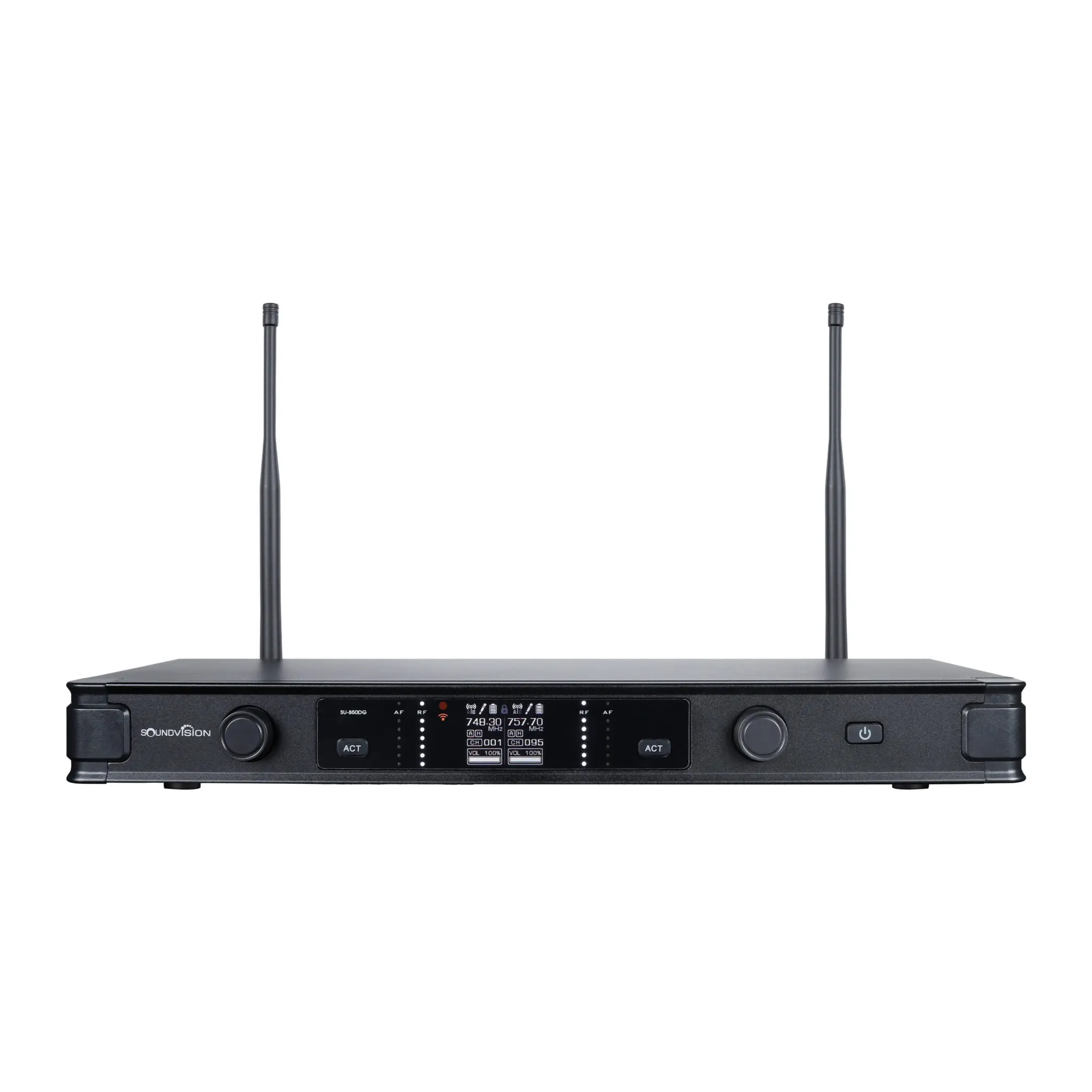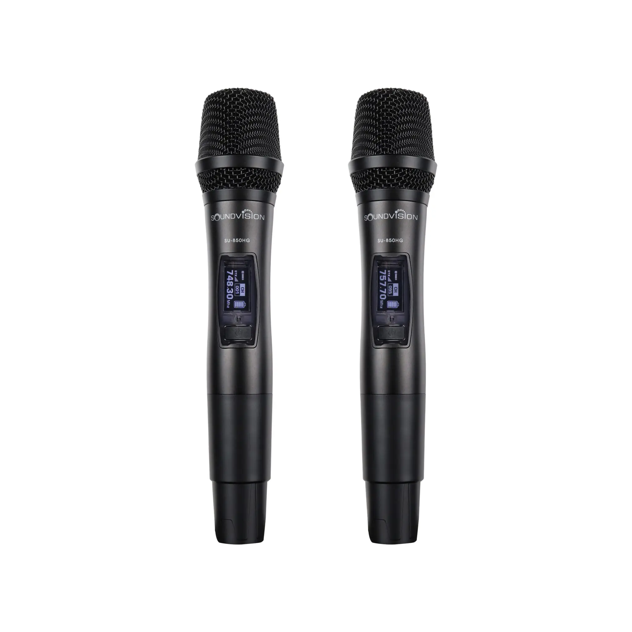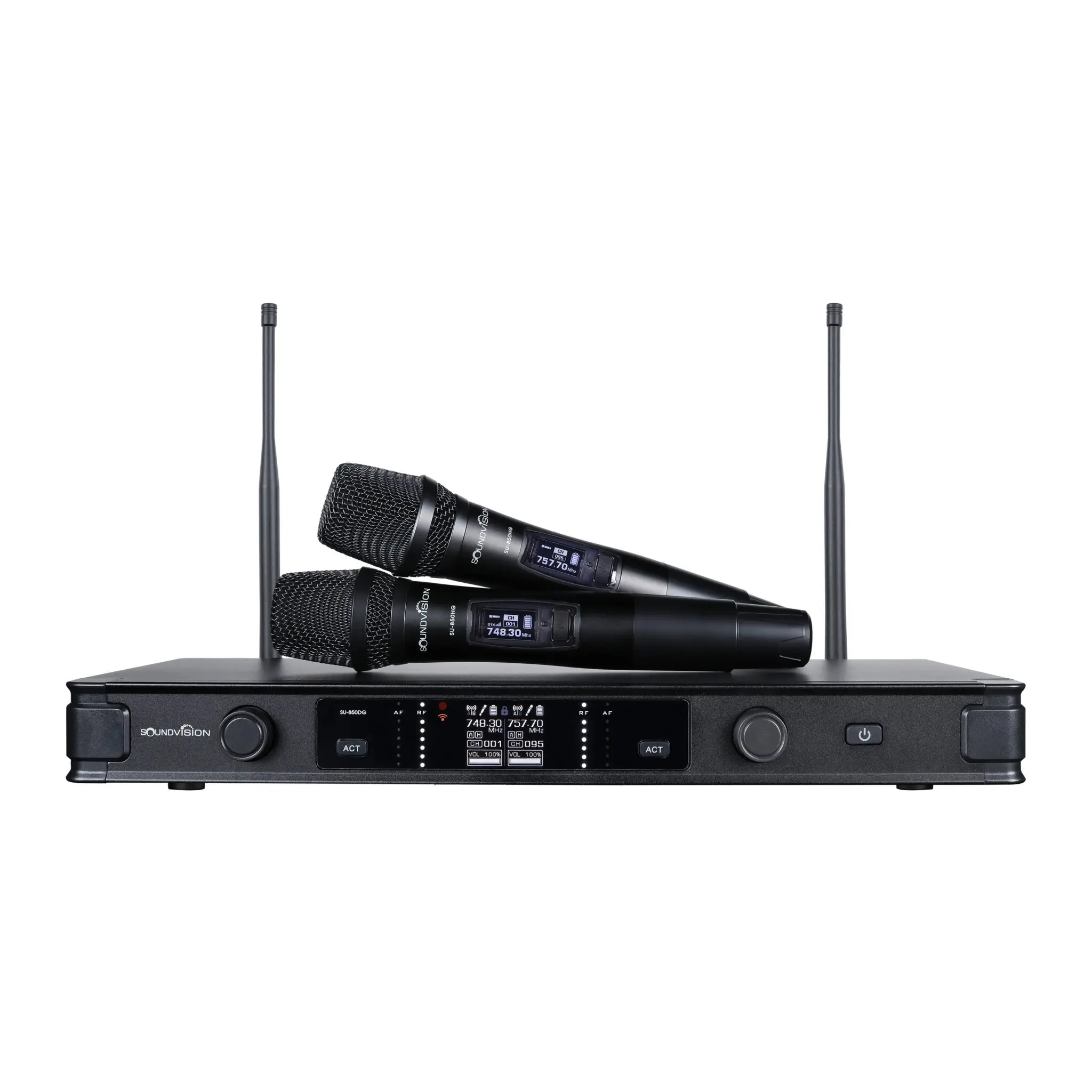 SOUNDVISION SU-850DG ไมโครโฟนไร้สายมือถือคู่ ช่วงย่านความถี่ UHF 748.3 ~ 757.7 MHz ตามข้อกำหนดของกสทช. (ประเทศไทย) สามารถเปลี่ยนช่อง ความถี่สัญญาณได้ 190 ช่อง (2 x 95) กำลังส่ง 5mW / 20mW รับสัญญาณได้ไกลถึง 100 เมตร (ที่โล่งแจ้ง) ด้วยตัวเครื่องรับสัญญาณ ที่เต็มประสิทธิภาพ ความสามารถในการป้องกันการ รบกวนที่ดีเยี่ยม และสามารถชาร์จไมโครโฟนกับเครื่องรับได้