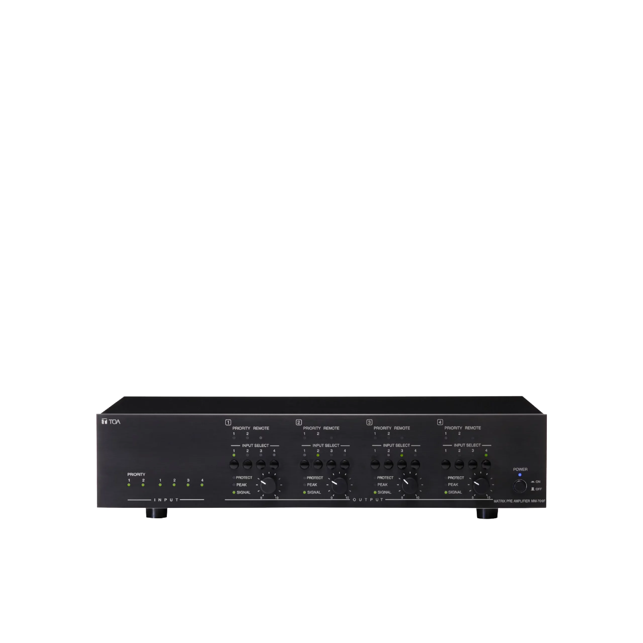 The MM-700F matrix pre-amplifier performs matrix controls from 4 LINE plus 2 MIC/LINE level inputs to 4 output channels. Each output channel features 64 DSP preset selections for general equalizations, crossover for sub-woofer, or variety of TOA’s speakers’ EQ settings. 2 MIC/LINE inputs have 1st and 2nd priority levels which can override at assigned output channels automatically or manually. If connected with optional WP-700-AM wall assignments and setup can be done by dip switches on its rear panel without laptop PC. This unit fits a wide-range of applications require multi-zone pagings and/or background music distribution at restaurants, pubs, retail stores, or factories, etc.
