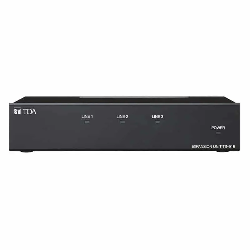 The TS-918 is an interface necessary for incorporating the Wired conference unit(s) in the conference system. It is connected to the TS-910 Central unit with a coaxial cable and to the TS-919B1 or TS-919B4 Bridge unit with a Category 5 cable. With the use of an optional rack mounting bracket, it can be mounted in an EIA Standard equipment rack (1 unit size).